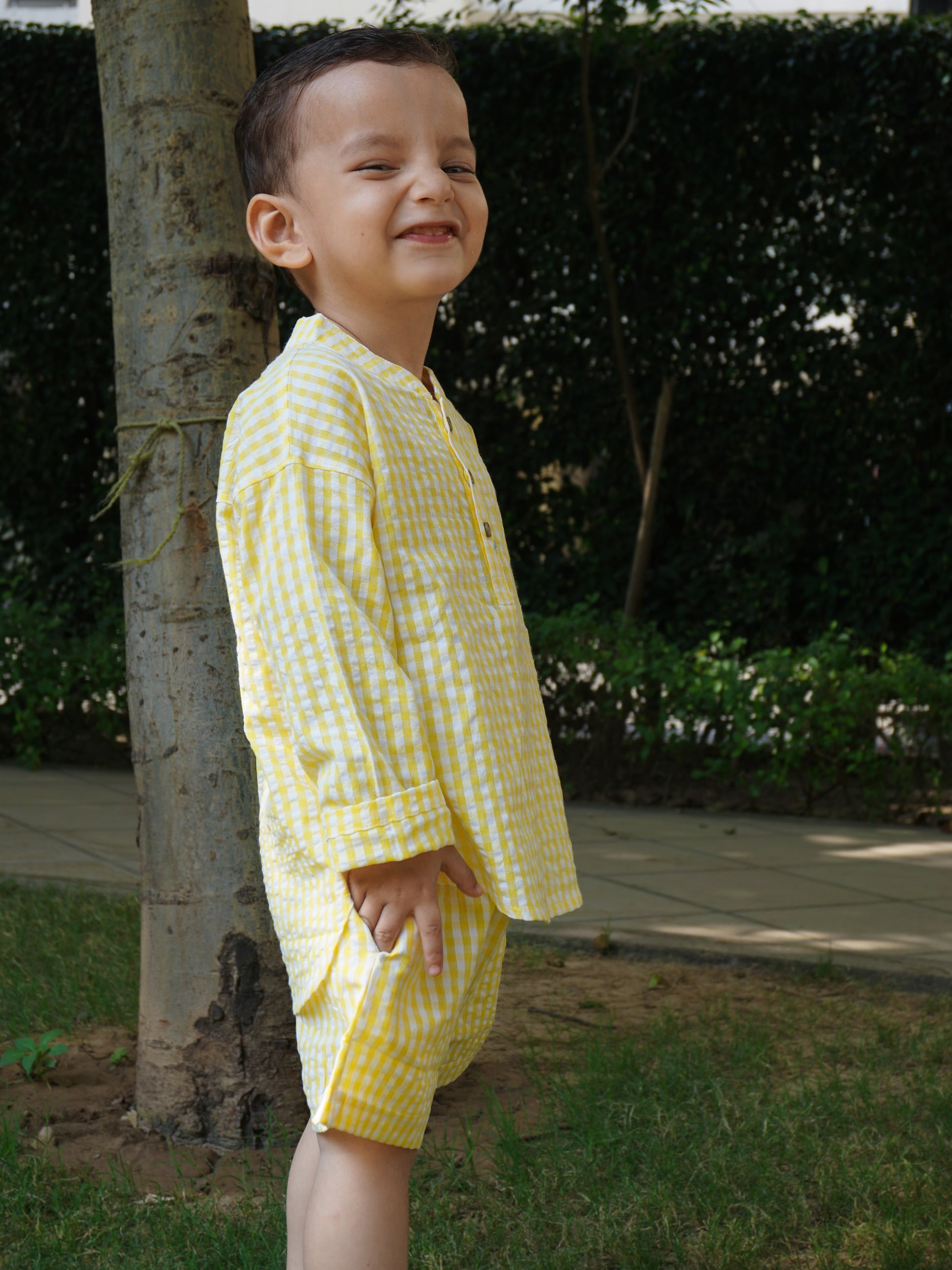 Our premium seersucker shirt and shorts set is designed specifically for India's hot summers, offering unparalleled comfort that keeps your child cool, happy, and effortlessly stylish.